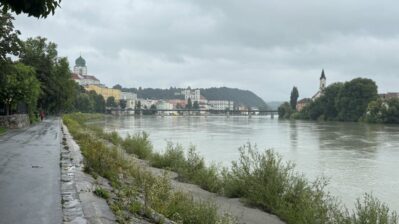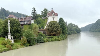 Am 3. August startete ich bei teilweisem Regenwetter über Trostberg, Altötting, Eggenfelden, wo ich noch einen alten Freund im Krankenhaus besuchte, bis noch Pfarrkirchen, wo mich nach 109 km gute Freunde herzlich begrüßten. Gottseidank hatte ich gute Regenkleidung dabei, denn am nächsten Tag ging es bei Dauerregen 80 km durch fruchtbare Schwemmlandböden des Inn´s, vor allem durch Maisfelder, aber auch Weizen-, Raps-, Soja-, Hirse- und Zuckerrübenfelder, weiter nach Salzweg bei Passau. Nach einem kurzen Abstecher nach Schärding in Österreich, mit Mittagessen beim Stadtwirt, ging es auf österreichischer Seite am Inn entlang durch Passau und dann hinauf nach Salzweg, wo mich Anna und Franz schon erwarteten. Wir hatten früher oft im Bayerischen landwirtschaftlichen Wochenblatt zusammengearbeitet, bei dem sie die Fachabteilungen Landtechnik, Familie und Haus und Garten leiteten.
