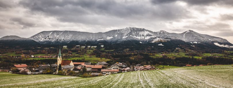 Wie ein grünes Band der Natur präsentierte sich am ersten Schneefalltag des heurigen Herbstes das Hochplateau Samerberg. Während auf Höhe der Aussichtskapelle noch ein grün-weißer Teppich und auf den höheren Lagen der Berge richtig Schnee zu sehen waren, waren die unteren Tallagen zwischen den Kirchen von Törwang und Grainbach noch aper. Das einem Gemälde gleichende Bild drückt untrügerisch aus, dass dem farbigen Herbst jetzt wieder frostigere Zeiten folgen können.