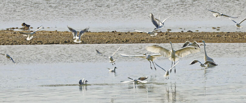 - Weiter geht es zum Aussichtsturm in Seebruck. Von hier sind die Rufe der Großen Brachvögel gut zu hören, aber sie halten sich leider sehr entfernt auf. Dann kann ein Schauspiel betrachtet werden. Zuerst stehen acht Silbereiher nahe beieinander und warten auf vorbeischwimmende Fische. Plötzlich gibt es lautes Möwengeschrei und ein größerer Trupp Lachmöwen scheint beim Fischen erfolgreich. Das wollen sich die Silberreiher nicht entgehen lassen und fliegen zu der Stelle, wo die Lachmöwen aktiv sind. Es wird ziemlich hektisch.