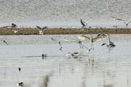 - Nun geht es zur letzten Station, dem Lachsgang. Hier hält sich ein größerer Trupp Blässgänse auf. Auf großer Distanz lassen sich die aufmerksamen Gänse fotografieren. Daneben sind sehr viele Graugänse auf den Wiesen. Auf der Landzunge ist Betrieb. Viele Mittelmeermöwen, einige Kormorane und Graugänse ruhen dort. Die Blässgänse sind auch dort eingetroffen. Mehrere Singschwäne halten ihren Verdauungsschlaf. Hier fühlen sie sich sicher. Zurück bei den Wiesen. Ein großer Trupp Graugänse umrundet fliegend mehrmals die Wiesen und landet dann auf einer, wo bereits eine Gruppe Graugänse sich aufhält.