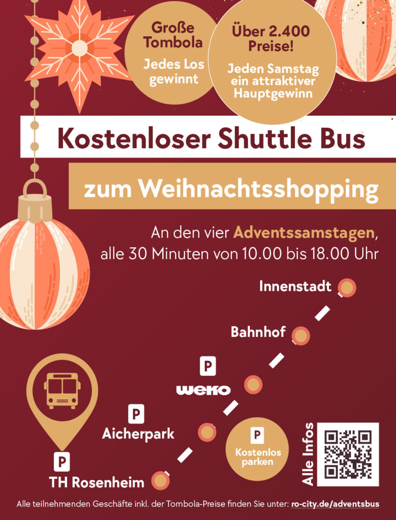Am ersten Adventssamstag ist dies ein 30-teiliges Rösle-Besteckset, bereitgestellt von WEKO. Es folgt ein cityscheck Paket im Wert von 100,-€ vom City-Management und ein 100,- € Einkaufsgutschein für ein Schmuckstück von „Bella D´Oro, Italian Jewellery“, der bei GALERIA Rosenheim eingelöst werden kann. Am vierten Samstag gibt es dann mit einem 16 Zoll Fahrrad von Lucky Bike etwas für die Kinder. Die beiden Shuttle-Busse fahren von Stadtmitte über den Bahnhof, WEKO, AicherPark, den TH Parkplatz, Loretowiese und das Parkhaus P9 zurück zur Stadtmitte bzw. gegenläufig. Außerdem werden alle auf der Linie liegenden innerstädtischen Haltestellen ebenfalls angefahren. Der Sonderfahrplan ist digital in der App, aber auch analog als Aushang an de Haltestellen zu finden. Mit dieser Aktion gibt es an jedem der Adventssamstagen zwischen 10:00 und 18:00 Uhr die Möglichkeit, entspannt mit dem Bus in die Stadt zu fahren, die Weihnachtseinkäufe zu erledigen, über den Christkindlmarkt zu schlendern, oder einfach nur die Weihnachtsstimmung zu genießen. Die Parkplätze an der Technischen Hochschule, im AicherPark und bei WEKO sind kostenfrei nutzbar. Außerdem gibt es spezielle Sonderaktionen bei WEKO und im AicherPark.