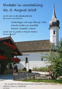 Es ist gute und schöne Tradition, dass die Pfarrgemeinde „Maria Himmelfahrt“ von Prien zu einer besinnlichen Einkehr in das Kirchlein nach Urschalling einlädt. Der nächste Termin ist am Sonntag, 5. August. Weitere Informationen können dem Plakat entnommen werden.