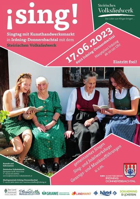 Am 17. Juni 2023 sollen daher beim 3. Singtag des Steirischen Volksliedwerks unter dem Motto ¡sing! die pure Lebensfreude und das Gemeinschaftsgefühl, die beim gemeinsamen Singen entstehen, spürbar gemacht werden. Dafür wird den ganzen Tag über an verschiedenen – fußläufig erreichbaren – „Platzln“ rund um die Irdninger Kirche gesungen und geklungen, das vielfältige Programm regt sowohl zum Zuhören als auch zum Mitsingen an. Programmpunkte sind u.a.: gemeinsames Singen, Mit-Singkurse mit Referentinnen und Referenten des Steirischen Volksliedwerks zu verschiedenen Schwerpunkten (Jodeln, regionale Lieder, Gstanzlsingen und Paschen, Schlager etc.) sowie Gesangs- und Musikaufführungen verschiedener Gruppen, Sängerinnen und Sänger aus der Region – und sogar ein norwegischer Chor hat sich angekündigt. Außerdem ist ein Kunsthandwerksmarkt ins Geschehen mit eingebettet, und kulinarisch wird man am Hauptplatz, der für den Durchzugsverkehr gesperrt ist, von den örtlichen Gastronomen versorgt.