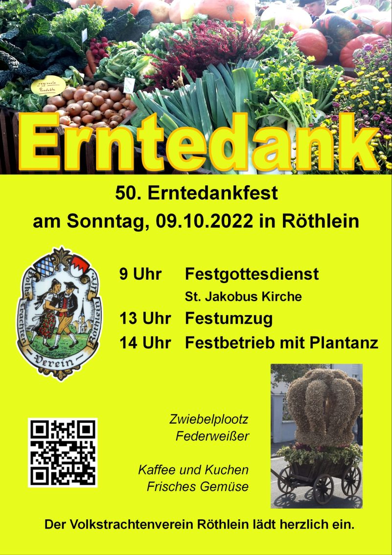 Bereits zum 50. Mal kann der Volkstrachtenverein Röthlein sein Erntedankfest feiern. Heuer findet es am Sonntag, den 09. Oktober statt. Der Festgottesdienst um 9 Uhr in der St. Jakobus Kirche ist ein guter Anlass für die reichhaltige Ernte zu danken.
