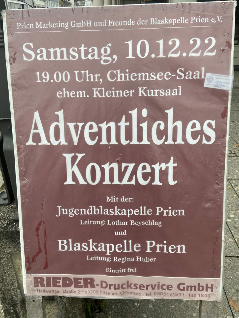 Fotos: Hötzelsperger – 1. Priener Blasmusikanten im Chiemsee-Saal – 2. Plakat Adventliches Konzert am 10. Dezember.