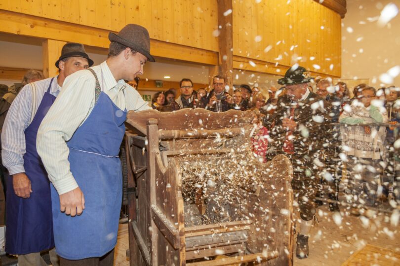 War das Getreide geerntet und auf den Hof gebracht, stand dem Bauern und seiner Familie eine weitere schweißtreibende Arbeit bevor – das Dreschen. Wie sich diese Arbeit im Laufe der Geschichte durch technische Hilfsmittel wandelte, zeigt das Freilichtmuseum Glentleiten des Bezirks Oberbayern am 3. Oktober, dem Tag der Deutschen Einheit. Die Bandbreite der von 11.00 bis 16.00 Uhr vorgeführten Dreschtechniken reicht dabei vom Dreschen per Hand mit Hilfe des Dreschflegels, über den Einsatz von Pferdestärken am Göpel, bis hin zur dampfbetriebenen Breitdreschmaschine.