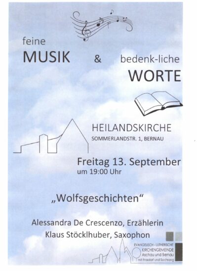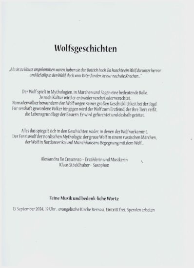 Am Freitag, 13. September um 19.00 Uhr erzählt die Grassauer Musikerin und Erzählerin Alessandra De Crescenzo “Wolfsgeschichten”, die Musik dazu spielt Klaus Stöcklhuber aus Pittenhart mit dem Saxophon.