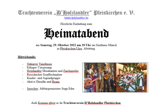 Am kommenden Samstag, 29. Oktober veranstaltet der Trachtenverein D’Holzlandler Pleiskirchen/Lkrs. Altötting um 20 Uhr wieder seinen traditionellen Heimatabend im Gasthaus Münch. Gemäß dem Motto “A Musi, a Liadl, a Tanz und a Boarisch Wort” singen, musizieren und tanzen der Edinger Viergesang, die Oakarrer Musi, die Holzlandler Nachwuchsmusikanten und Ziacherer, die Trachtenjugend sowie die aktiven Tanz- und Plattlergruppen des Vereins.