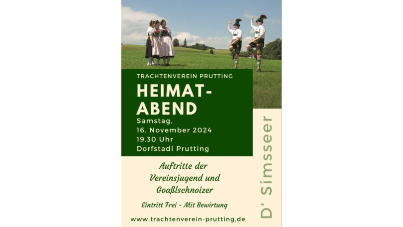 Der Trachtenverein “D’Simsseer” Prutting lädt am Samstag, den 16. November 2024, um 19:30 Uhr zu einem Heimatabend im Dorfstadl Prutting ein.