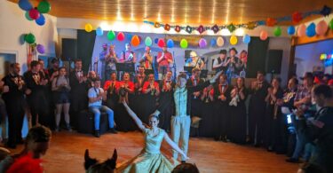 Bericht und Bild: SC Frasdorf e.V. – Clown Elli beim Kinderfasching 2020 zwischen den vielen Besucher*innen.