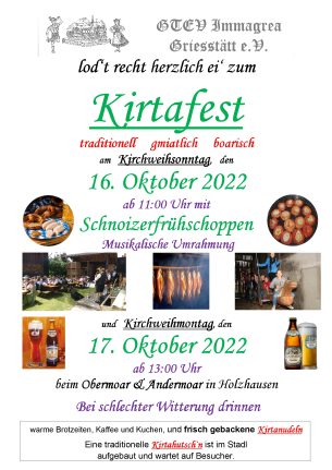 Nach drei Jahren Corona-Pause findet in diesem Jahr endlich wieder das traditionelle Kirtafest des Trachtenvereins am Kirchweihsonntag und –Montag statt. Dieses Mal beim Obermoar und Andermoar in Holzhausen. Das Fest beginnt morgen, Sonntag um 10 Uhr (Uhrzeit auf dem Plakat ist falsch) mit einem Schnoizerfrühschoppen der Griesstätter Goaßlschnoizer. Passend dazu werden frische Weißwürste serviert. Natürlich gibt es an beiden Tagen auch wieder die guatn Kirtaschmankerl, wie die frisch gebackenen Kirtanudln, zudem warme Brotzeiten und Kaffee und Kuchen. Auch das süffige Kirtabier fehlt natürlich nicht. Und vor allem auf die Kinder wartet die traditionelle Kirtahutsch. Der Trachtenverein und die Goaßlschnoizer freuen sich auf einen zahlreichen Besuch zu diesem gmiatlichen, boarischen Fest und für eine gute musikalische Unterhaltung ist ebenfalls gesorgt. Am Kirchweihmontag beginnt das Fest um 13 Uhr, bei schlechter Witterung findet die Bewirtung in den Innenräumen des Obermoarhofs statt.