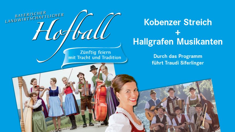 Das Bayerische Landwirtschaftliche Wochenblatt lädt wieder alle Tanzbegeisterten und Genießer der bayerischen Lebensart ein, zünftig mit Tracht und Tradition zu feiern. Der 7. Hofball findet am Sonntag, den 2. Februar 2020 im Deutschen Theater in München statt. Für Tanz und Unterhaltung sorgen diesmal die Hallgrafen Musikanten und die Kobenzer Streich. Durch das Programm führt wie gewohnt Traudi Siferlinger. Außerdem leitet Magnus Kaindl wieder gekonnt über das Tanzparkett. Um Ihr leibliches Wohl kümmert sich die gute Küche im Deutschen Theater. Freuen Sie sich auf eine unvergessliche und rauschende Ballnacht mit Tracht und Tradition!