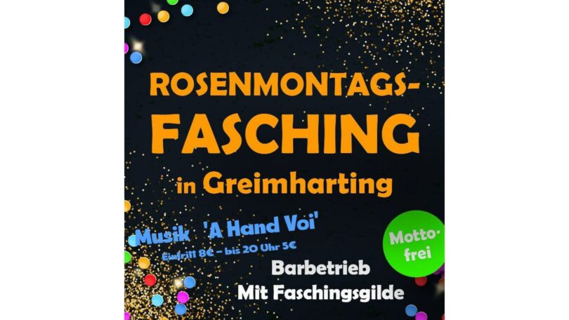 Am Rosenmontag findet in Greimharting eine Faschingsveranstaltung statt. Für musikalische Unterhaltung sorgt die Band „A Hand Voi“.