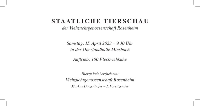 Eine Staatliche Tierschau der Viehzuchtgenossenschaft (VZG) Rosenheim unter der Schirmherrschaft von Landrat Otto Lederer findet am Samstag, 15. April ab 9.30 Uhr in der Oberlandhalle beim dortigen Zuchtverband in Miesbach statt. Nur alle zehn Jahre wird die VZG Rosenheim mit dieser ehrenvollen, aber auch herausfordernden Aufgabe betraut. Zuletzt waren diese unter anderem in Festzelten und in Raubling-Hochstraß. Das nunmehrige und ganztägige Programm in der Oberlandhalle von Miesbach sieht unter anderem einen Auftrieb von rund 100 Fleckviehkühen mit Richten der Ausstellungstiere, Grußworte sowie die Vorstellung der Nachzuchtgruppen vor. Der Siegerehrung mit Vergabe der Züchtermedaillen folgen der Bambini-Cup der Jungzüchter aus den Reihen der VZG Rosenheim sowie der nachmittägliche Abtrieb. Markus Dinzenhofer, Erster Vorsitzender der VZG Rosenheim freut sich, dass mit der Tierschau wieder eine öffentliche Präsentation landwirtschaftlicher und züchterischer Erfolge präsentiert werden können. Für alle interessierten Besucher gibt es zudem eine passende Bewirtung.