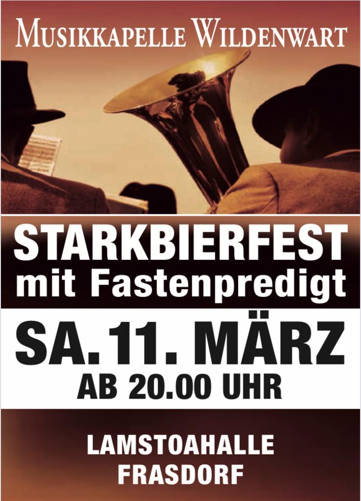 Am Samstag, 11. März geht es wieder auf in der Lamstoahalle von Frasdorf wenn die Wildenwarter Blaskapelle zum traditionsreichen Starkbierfest mit viel Blasmusik und kulinarischen Schmankerln einlädt.