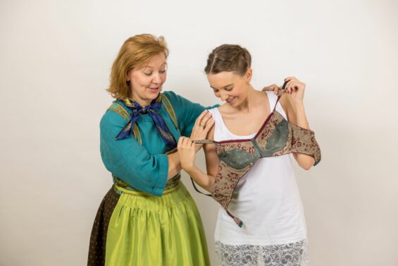 Beim TrachtenTuning werten Interessierte lange getragene Mode mit traditionellen Techniken wie Rüschen oder Einfassungen auf. Von Grund auf neue Stücke entstehen in den Kursen „Werktagsgewand“ und „Spenzer – Boarisches Gwand“. In weiteren Lehrgängen gestalten die Teilnehmenden die passenden BHs zur Tracht oder fertigen Posamentenknöpfe nach Viktorianischem Vorbild. Trachten-Werkwochen leben vom fachlichen Austausch. Die gesellige Stimmung tut ihr Übriges, damit alle in diesen sieben Tagen ihre handwerklichen Fertigkeiten verfeinern und zufrieden mit ihren passenden Schnitten nach Hause gehen“, sagt die Leiterin der Trachtenkultur-Beratung, Monika Hoede.