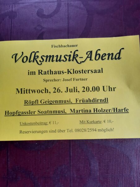 Ein Volksmusik-Abend wird am Mittwoch, den 26. Juli, um 20 Uhr im Rathaus-Klostersaal in Fischbachau veranstaltet. Es spielen die Musikgruppen Röpfl Geigenmusi, Früahdirndl und Hopfgassler Soatnmusi sowie Martina Holzer an der Harfe. Als Sprecher fungiert Josef Furtner.