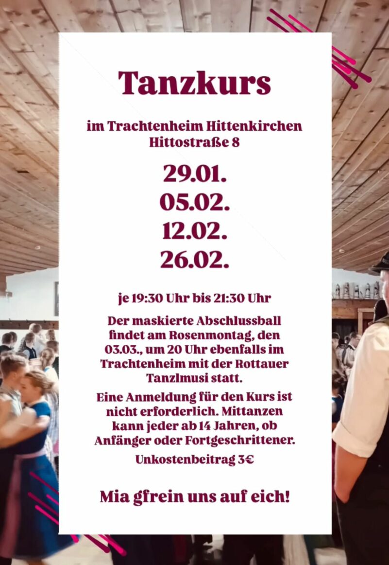 Der Trachtenverein „Almarausch“ Hittenkirchen lädt auch dieses Jahr Jugendliche ab 14 Jahren zu einem Volkstanzkurs ein. Die Tanzabende beginnen an diesem Mittwoch, 29. Januar 2025, im Trachtenheim Hittenkirchen und finden an drei weiteren Mittwochabenden (5., 12. und 19. Februar) jeweils von 19.30 bis 21.30 Uhr statt. Unter der bewährten Leitung von Florian Wörndl werden traditionelle Tänze wie Walzer, Landler, Polka, Boarischer, Chiemgauer und Altbairische vermittelt. Eine Anmeldung ist nicht erforderlich, und sowohl Anfänger als auch Fortgeschrittene sind herzlich willkommen. Der Unkostenbeitrag beträgt je Abend 3 Euro.