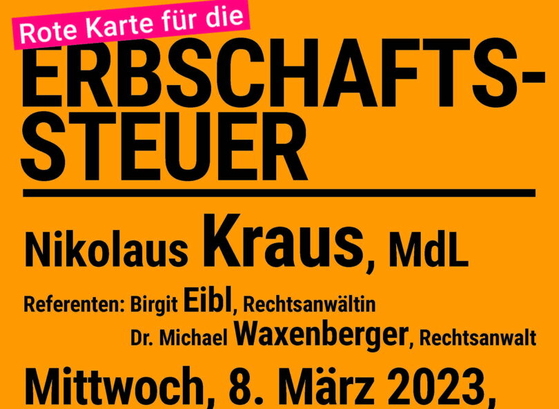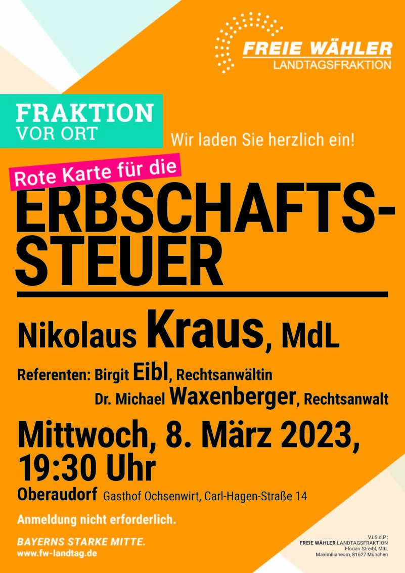 Am Mittwoch, 8.März findet um 19:30 Uhr im Gasthof Ochsenwirt in der Carl-Hagen-Straße 14 in Oberaudorf ein Infoabend zur Erbschaftsteuer der Landtagsfraktion der Freien Wähler statt.