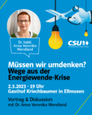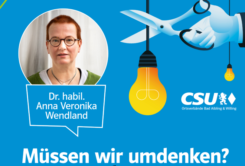 Am Donnerstag, 2. März 2023 um 19 Uhr laden die CSU Ortsverbände Bad Aibling und Willing im Gasthaus Kriechbaumer in Ellmosen (Ellmosen 60, 83043 Bad Aibling) zu einem interessanten Informations- und Diskussionsabend ein. Unter dem Titel „Müssen wir umdenken? Wege aus der Energiewende-Krise“ wird die Osteuropa- und Technikhistorikerin aus Marburg, Frau Dr. Anna Veronika Wendland, die aktuelle Lage analysieren und einen Ausweg aus dem Dilemma vorstellen: ein integriertes System aus Erneuerbaren Energien und Kernenergie, das Klimasicherheit und Versorgungssicherheit versöhnen kann. Wendland ist eine gefragte Gesprächspartnerin der Medien für Fragen der Energiedebatte und der Reaktorsicherheit (bspw. im Juni 2022 hier im SWR).