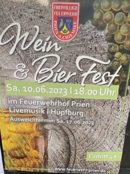Zu einem zünftigen Wein- und Bierfest lädt die Freiwillige Feuerwehr Prien am Samstag, 10. Juni ab 18 Uhr in den Hof der Feuerwehr ein.