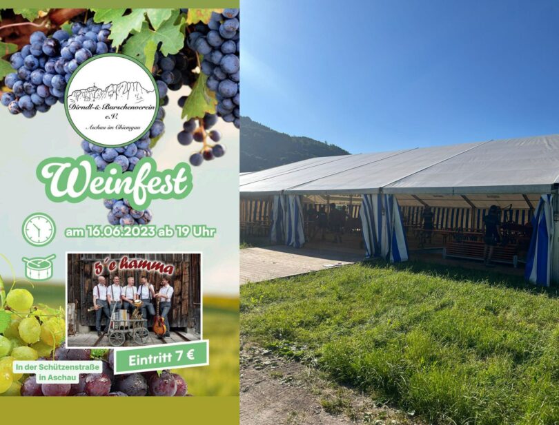 Am kommenden Freitag, den 16. Juni, findet das diesjährige Weinfest des Dirndl- und Burschenvereins Aschau statt. Ab 19.00 Uhr sorgt hierbei die Musikgruppe 5’e Hamma für gute Unterhaltung im Zelt am Aschauer Marktplatz in der Schützenstraße.