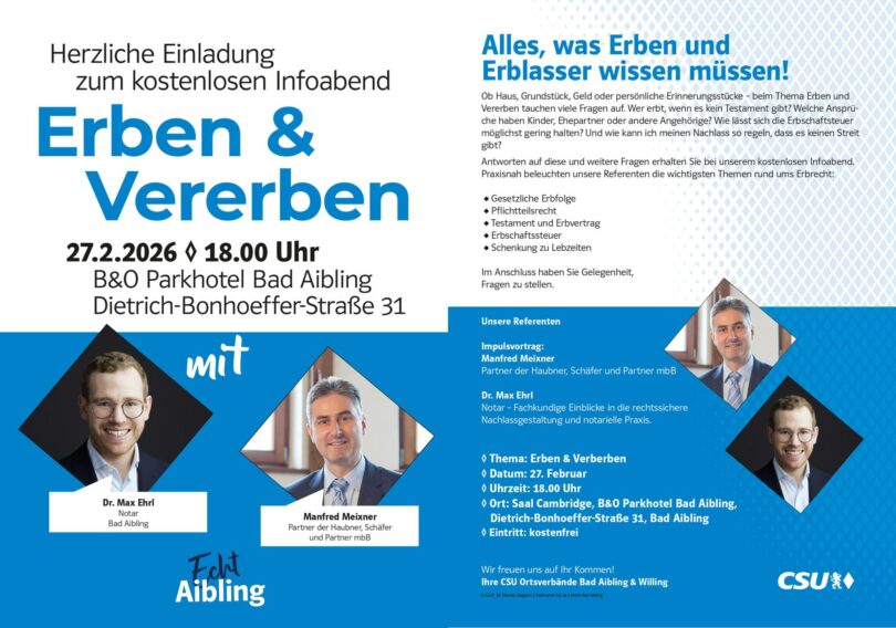 Die CSU Bad Aibling lädt zu unserem Infoabend zum Thema „Erben & Vererben“ ein. Die Veranstaltung findet am Freitag, den 27. Februar 2026, um 18 Uhr im B&O Parkhotel Bad Aibling (Saal Cambridge), Dietrich-Bonhoeffer-Straße 31 statt.