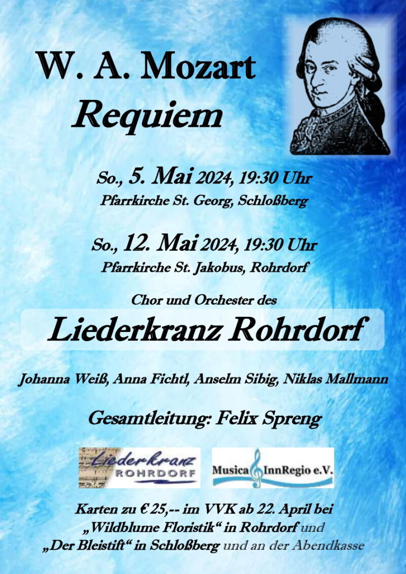 Der Liederkranz Rohrdorf unter der Leitung von Felix Spreng lädt an den ersten beiden Sonntagen im Mai, jeweils um 19.30 Uhr, zu Kirchenkonzerten mit dem Mozart-Requiem ein. Die mehr als 60 Sängerinnen und Sänger werden in der Schlossberger Pfarrkirche St. Georg (5. Mai) und in der Rohrdorfer Pfarrkirche St. Jakobus (12. Mai) von einem großen Orchester mit Streichern und Bläsern begleitet. Die Besucher können sich auf ein besonderes Konzerterlebnis freuen. Karten gibt es im Vorverkauf ab 23. April bei „Wildblume Floristik“ in Rohrdorf und ab 22. April bei „Der Bleistift“ in Schlossberg. Restkarten sind an der Abendkasse erhältlich.