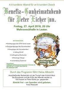 Einen Benefiz-Gauheimatabend für den vor einiger Zeit schwer verunglückten Peter Eicher junior aus Weißbach an der Alpenstraße veranstaltet der Gauverband I am Freitag, 27. April ab 20 Uhr in der Mehrzweckhalle in Lauter. An dem Abend unter dem Motto „A b´sunderer Abend für an b´sundern Zweck“ wirken mit die Kindergruppe vom GTEV Surtal Lauter, die Gaujugendgruppe des Gauverbandes I, die Gaugruppe vom Gauverband I, die Anfang Dirndl, die Außergebirg Musikanten, die Rimstinger Sänger, die Lenzensberg Soatnmusi sowie Ansager Heine Albrecht. Dem offiziellen Programm folgt noch eine Bar-Betrieb mit der Trumpf- oder Kritisch-Musi. Alle Einnahmen kommen Peter Eicher junior zugute, der Eintritt ist bei freie Platzwahl frei, Spenden werden erbeten.