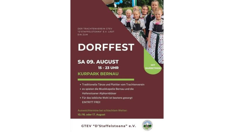 Der Trachtenverein „D’ Staffelstoana“ e.V. lädt am Samstag, 9. August, zum traditionellen Dorffest in den Bernauer Kurpark ein. Ab 15 Uhr erwartet die Besucher ein abwechslungsreiches Programm rund um bayerisches Brauchtum und geselliges Beisammensein.