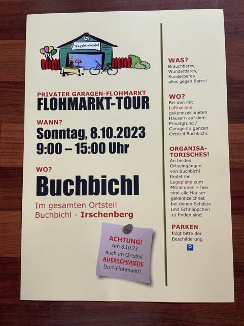 Nach dem großen Anklang des 1. Buchbichler Flohmarktes im letzten Jahr hat sich das Organisationsteam um Ilona Simbeck dazu entschlossen, auch heuer wieder einen Garagen-/Vorplatz-Flohmarkt durchzuführen.