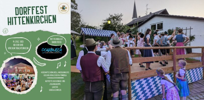 An diesem Samstag, 19. Juli 2025, lädt die Dorfgemeinschaft Hittenkirchen wieder ab 17 Uhr zu ihrem traditionellen Dorffest am Trachtenheim ein. Für musikalische Unterhaltung sorgt die Musikgruppe „Ochablech“ aus dem Achental. Neben einem regen Barbetrieb wird Deftiges vom Grill, hausgemachte Kuchen sowie kühles Bier vom Hofbräuhaus Traunstein geboten. Für die Kinder organisiert die katholische Landjugend außerdem eine Tombola mit vielen schönen Preisen. Auftritte der Kinder-, Jugend- und Aktivengruppe des Trachtenvereins sowie der Goaßlschnalzer runden das Programm ab.