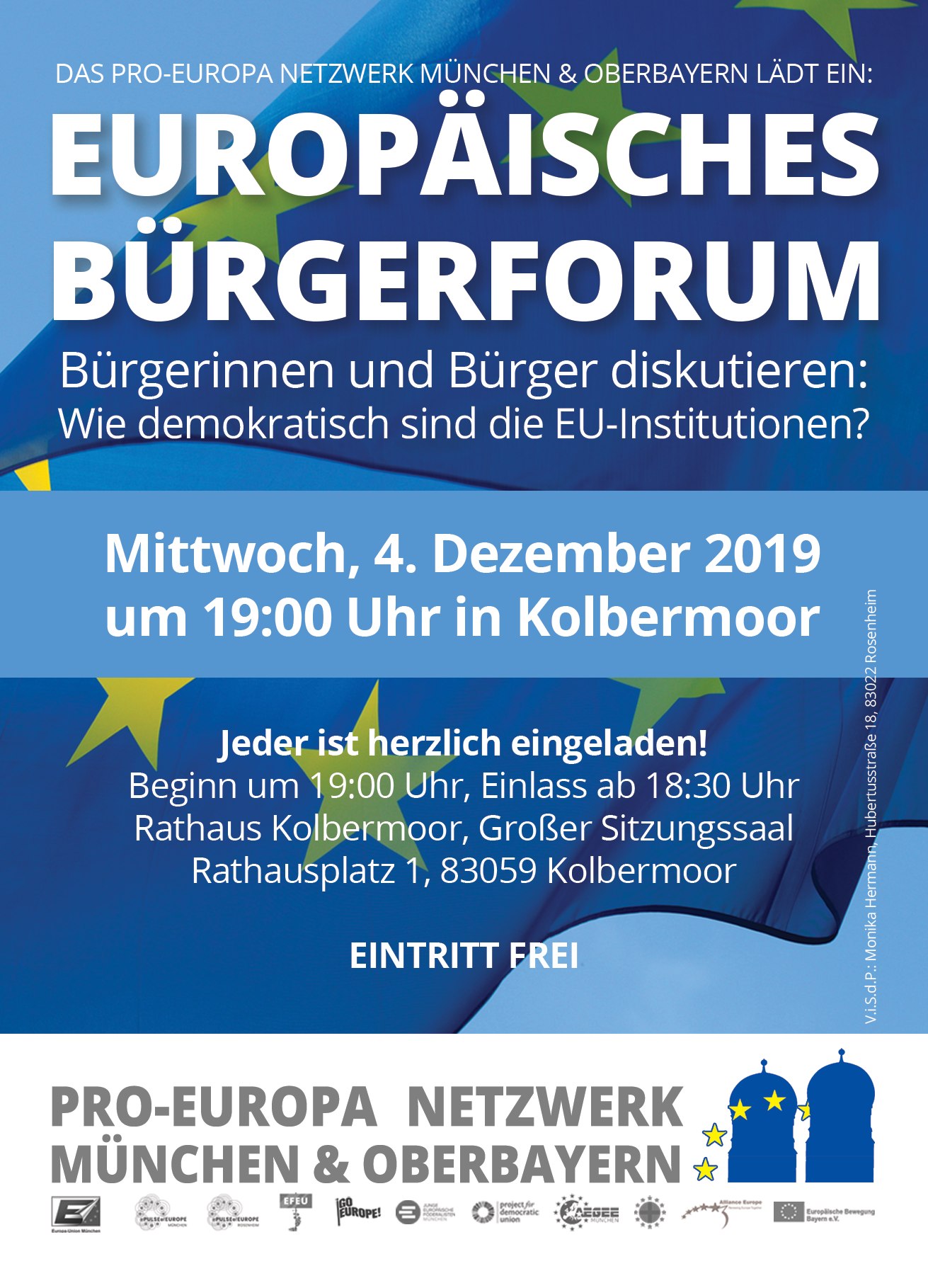 Die unabhängige proeuropäische Organisation “Pulse of Europe” lädt am 4. Dezember 2019 ein zu einem Bürgerforum unter dem Motto “Wie demokratisch sind die EU-Institutionen?”. Beginn ist um 19 Uhr im großen Sitzungssaal des Rathauses der Stadt Kolbermoor. Nachfolgend das Informationsschreiben von Pulse of Europe: