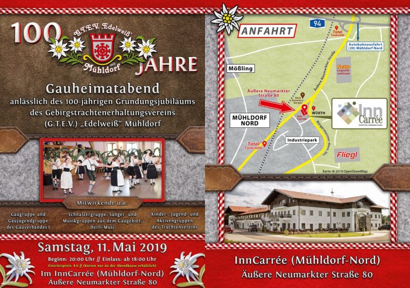 Der Trachtenverein G.T.E.V. “Edelweiß” Mühldorf kann in diesem Jahr auf sein hundertjähriges Bestehen zurückblicken. Die Mühldorfer Trachtler wollen dieses Jubiläum mit verschiedenen Veranstaltungen feiern.