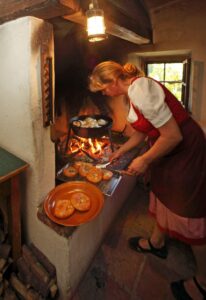 Zur Kirchweih gehört traditionell Schmalzgebackenes wie diese über offenen Feuer ausgebackenen Auszognen. Bildquelle: Bezirk Oberbayern, Archiv FLM Glentleiten, Foto: Nixdorf.
