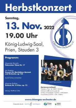 Am 13. November 2022 um 19.00 Uhr wird das Chiemgau-Orchester unter der Leitung von Matthias Linke sein traditionelles Herbstkonzert im König-Ludwig-Saal in Prien am Chiemsee präsentieren.