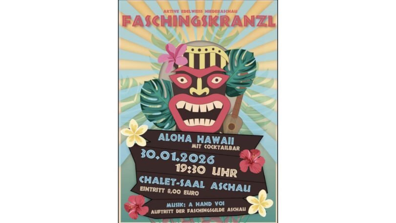 Der Trachtenverein „Edelweiß“ Niederaschau lädt am 30. Januar 2026 zum Faschingskranzl unter dem Motto „Aloha Hawaii“ ein. Beginn ist um 19:30 Uhr im Chalet-Saal Aschau.