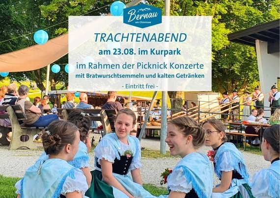 Im Rahmen der Bernauer Picknick Konzerte findet am 23. August der “Trachtenabend” mit der Hittenkirchner Trachten- und Musikgruppe im grünen Ortskern statt. Die kulinarische Verpflegung übernimmt der Trachtenverein Bernau: Es gibt Bratwurschtsemmeln und kühle Getränke.