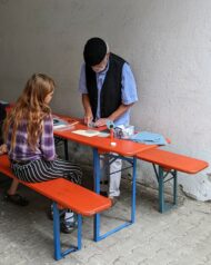 Für Kinder und Jugendliche gibt es verschiedene Möglichkeiten, sich kreativ zu beschäftigen (Malmobil v. Kunst und Soziales e.V.; Malen mit der Künstlerin Roswitha Strahl).