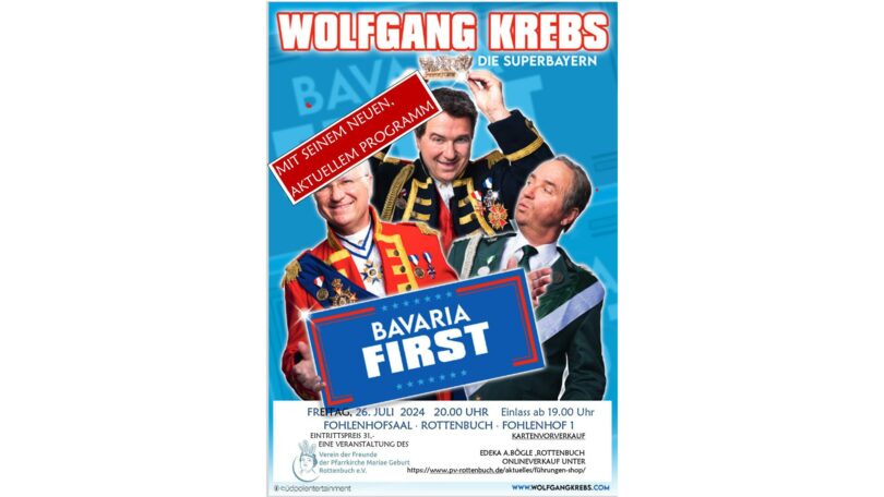 Ein weiteres Highlight des Festsommers in Rottenbuch findet am 26. Juli 2024 statt, wenn Wolfgang Krebs, ein enger Freund der Pfarrgemeinde, sein Programm “Bavaria First” präsentiert, nachdem er bereits im letzten Jahr mit großem Erfolg aufgetreten ist. Der Festsommer an der Freywis Orgel hält darüber hinaus eine Vielzahl weiterer Termine bereit, die man dem entsprechenden Flyer entnehmen können.