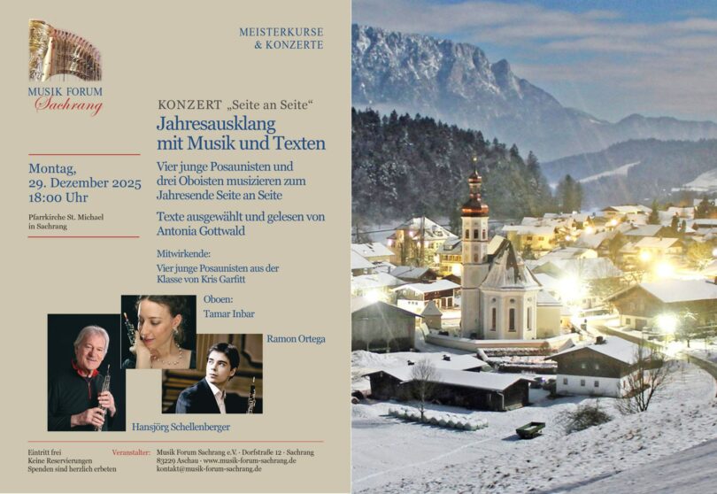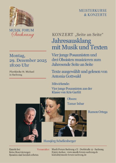 4 Junge Studenten aus der Posaunenklasse von Prof. Garfitt an der Musikhochschule Trossingen werden gemeinsam neben den beiden erfahrenen Oboisten Ramon Ortega und Hansjörg Schellenberger auftreten. Dazu liest die in Sachrang lebende Schauspielerin Antonia Gottwald Texte, die sie selbst ausgesucht und zusammengestellt hat. Der thematisch-künstlerische Gedanke ist es, in diesem Konzert Leichtigkeit, Fröhlichkeit und Frieden zu vermitteln in bedrohlichen Zeiten am Ende 2025 und Beginn 2026.
