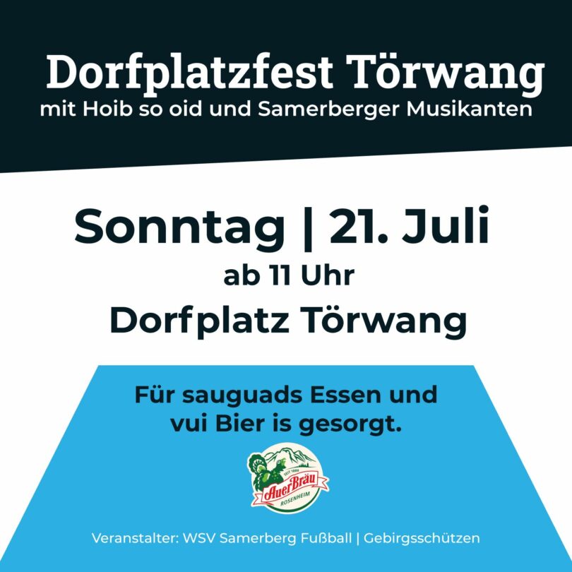 Dorfplatzfest in Törwang. Ein Dorffest auf dem malerischen Törwanger Dorfplatz veranstalten der Wintersportverein Samerberg (WSV) und die Samerberger Gebirgsschützen-Kompanie am Sonntag, 21. Juli 2024 ab 11 Uhr.