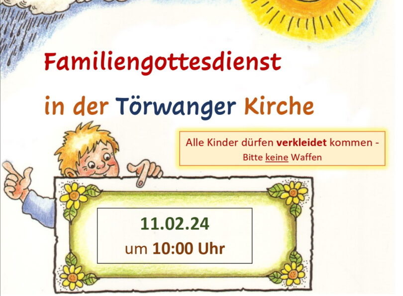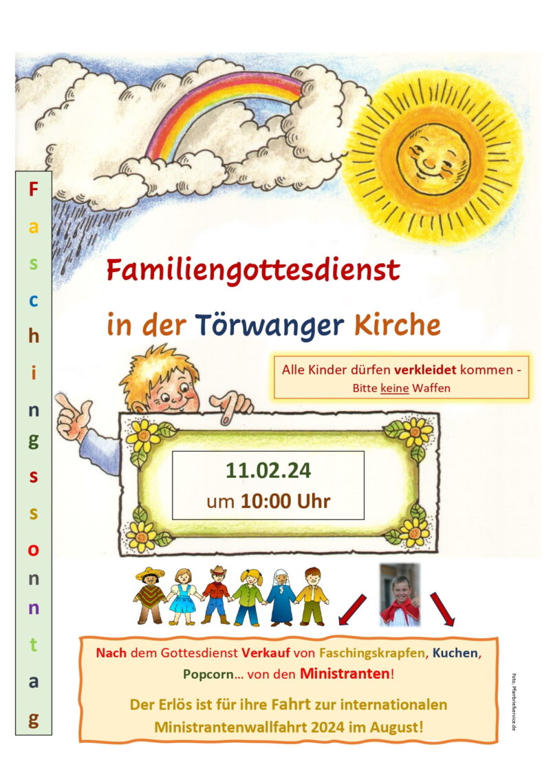 Ein Familiengottesdienst am Faschingssonntag, 11. Februar findet ab 10 Uhr in der Pfarrkirche “Mariä Himmelfahrt” in Törwang auf dem Samerberg statt. Dazu können alle Kinder verkleidet kommen (ohne Waffen).