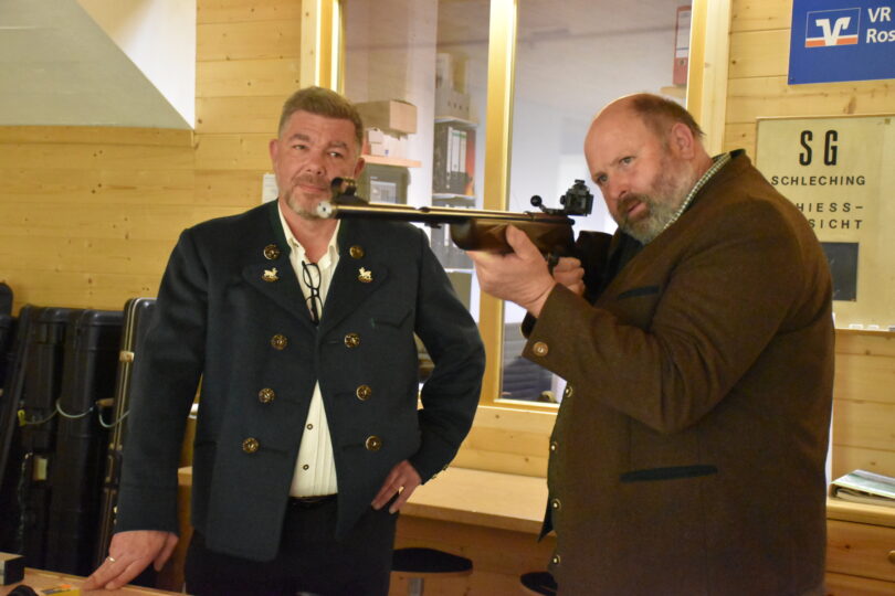 Bericht: Sybilla Wunderlich – Foto Uwe Wunderlich – Beim Üben im Schützenheim rechts Bürgermeister Josef Loferer links Vorstand Rudi Maldaner