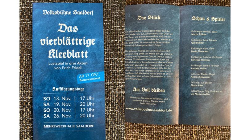 Die Volksbühne der Berchtesgadener Gemeinde Saaldorf spielt in der Saaldorfer Mehrzweckhalle an 4 Terminen im November das Lustspiel “Das vierblättrige Kleeblatt” von Erich Friedl. Kartenvorverkauf zum Preis von 6 Euro ist noch möglich im Rathaus Saaldorf-Surheim (Tel. 08654 / 6307-16).