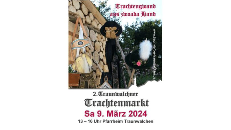 Am Samstag, den 9. März 2024, lädt der Trachtenverein Traunwalchen herzlich zum zweiten Trachtenmarkt ein. Von 13:00 bis 16:00 Uhr haben Besucher die Möglichkeit, im Pfarrheim von Traunwalchen traditionelle Trachten und handgefertigte Kunstwerke zu bestaunen und zu erwerben.