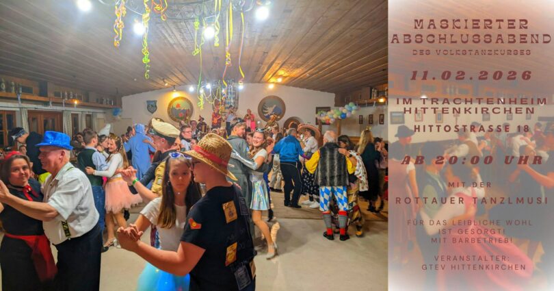 Am kommenden Mittwoch, 11. Februar, um 20 Uhr findet nun der Abschlussabend statt, mit dem der Kurs offiziell beendet wird. Hier haben die jungen Teilnehmer die Möglichkeit, das Erlernte in der Praxis anzuwenden. Im Unterschied zu den vorherigen Kursabenden sind beim Abschlussabend auch alle älteren Volkstanzliebhaber herzlich eingeladen. Außerdem ist wie im Fasching üblich eine Maskierung erwünscht. Für die passende Musik sorgt die Rottauer Tanzlmusi.