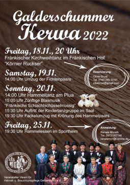 - Fränkischer Kirchweihtanz im Fränk. Hof mit den „Körnier Rucksern“, Kartenreservierung bei Oliver Brust, Tel. 0160/2455067 oder olliebrust@gmail.com.