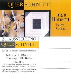 Inga Hansen stellt vom 6. Oktober bis 1. Dezember 2019 im „Vivarium“ in Höslwang neue Exponate auf den Gebieten Malerei und Collagen aus. Unter dem Ausstellungstitel „Querschnitt“ verbergen sich einerseits ein Querschnitt ihres umfangreichen künstlerischen Schaffens der beiden letzten Jahrzehnte, andererseits auch unterschiedliche Stilrichtungen im Genre Malerei und Collagen zum Teil mit ungewöhnlicher Schnitttechnik und verschiedensten Materialien.