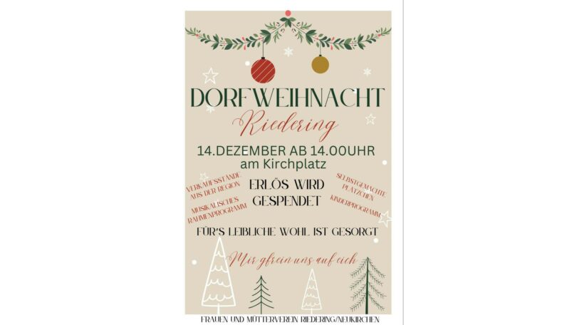 Stimmungsvolle Musik, Speisen & Getränke, Kinderprogramm und regionale Verkaufsstände sind auch in diesem Jahr wieder bei der Riederinger Dorfweihnacht am Samstag, 14. Dezember geboten. Von 14-18 Uhr sorgen der Frauen- und Mütterverein sowie zahlreiche helfende Hände anderer Vereine am Pfarrplatz für weihnachtliche Atmosphäre. Auftakt des Musikprogramms sind die Marienkäferkinder unter der Leitung von Cordula Hausstätter. Weiter geht es mit den Juniorbläsern und auch die Lobpreisengerl werden zwischendurch ihr bestes Geben. Als Beschäftigung für die Kinder wird im Pfarrheim gemeinsam gebastelt und es kommt eine unterhaltsame Überraschung. Zahlreiche regionale Verkaufsstände sorgen für ein adventliches Einkaufserlebnis, bei dem noch das ein oder andere Weihnachtsgeschenk besorgt werden kann.